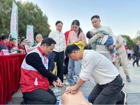活动现场人头攒动,熙熙攘攘,在急救科普摊位前,也围满了群众,红十字急救师资张勇军、黎素芳、鲁新军、刘艳红用浅显易懂的语言为大家做了科普,什么样的人群需要做心肺复苏,如何在极短的时间里做快速准确的识别判断。利用模拟人现场进行心肺复苏、海姆立克急救法等救护技能实操演示,对围观群众做一对一的实操练习,确保每位学习的群众都能够基本掌握心肺复苏、海姆立克急救技能。