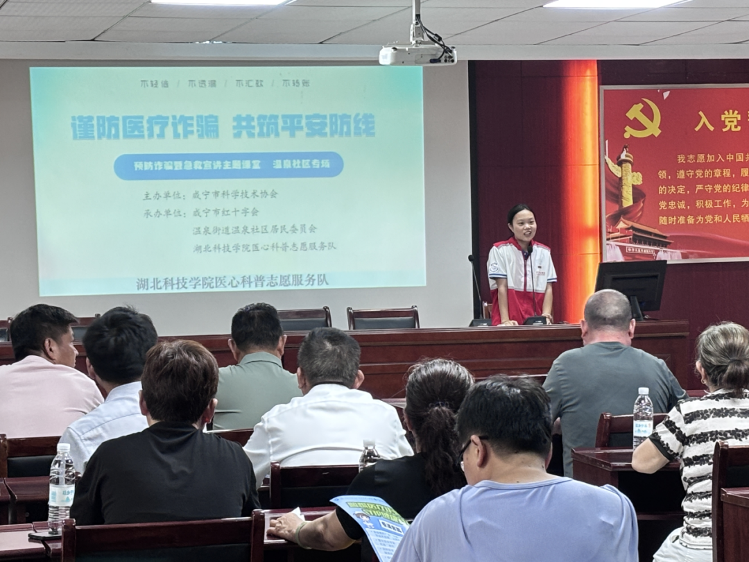 为切实提升社区居民的反诈意识与应急救护能力,8月13日,一场兼具实用性与趣味性的“医路反诈筑防线,全民健康共平安”主题反诈与急救活动在温泉社区热闹开展。此次活动由咸宁市科学技术协会、咸宁市红十字会和温泉社区居民委员会联合支持,湖北科技学院医心科普志愿服务队策划执行。