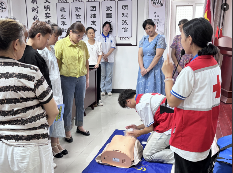 在急救技能培训环节,红十字志愿者以“理论讲授+实操演练”的方式重点讲解了心肺复苏术的按压部位、按压深度、频率等核心要点,结合人体模型进行实操示范。同时演示了自动体外除颤器(AED)的使用方法,志愿者特别强调了AED使用的安全准则,比如电极片要避免接触水和金属物品,使用过程中要保护好设备避免碰撞等。现场居民纷纷上前围拢学习,跟随着志愿者的操作手法练习起来。