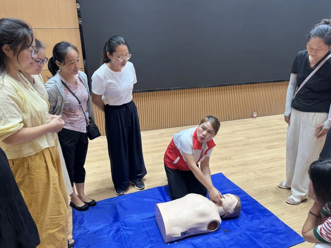 培训伊始,救护师资就用通俗易懂的讲解打破了理论课的枯燥——从心肺复苏的“黄金4分钟”讲到AED的“直观式操作”,从气道异物梗阻的“海姆立克急救法”讲到创伤救护的“包扎小技巧”,每一个知识点都结合校园常见场景举例,听得老师们频频点头。一旁的红十字志愿者更是亲身示范,“按压姿势对不对?”“包扎松紧合不合适?”志愿者反复调整动作,直到大家看明白、学透彻。