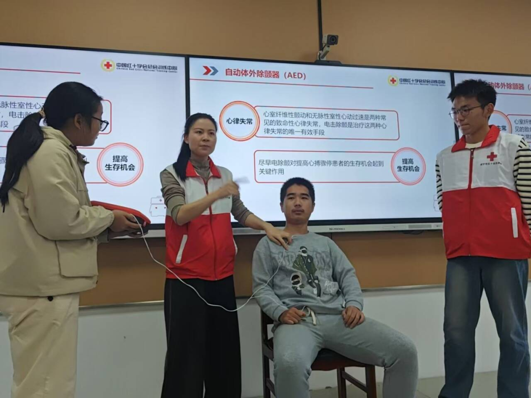 配合,演示除颤仪操作、手臂与头部包扎技巧以及海姆立克急救法的动作要领,增强学员的实际操作体验。