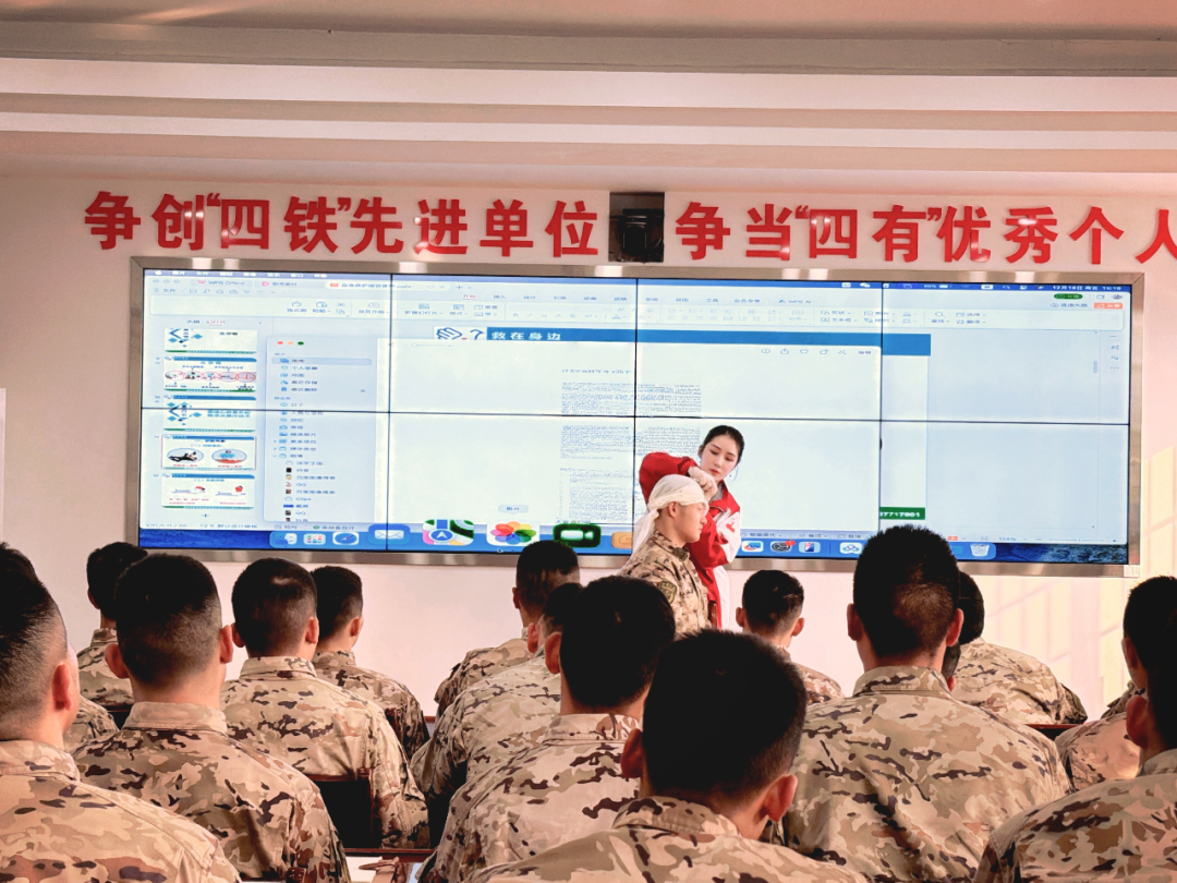 培训围绕核心急救技能展开。在理论学习环节,师资通过多媒体课件,系统讲解心肺复苏(CPR)、自动体外除颤器(AED)使用、创伤止血包扎、骨折固定及气道异物梗阻急救等知识与操作要点。官兵听课专注,认真记录,展现出高涨的学习热情。