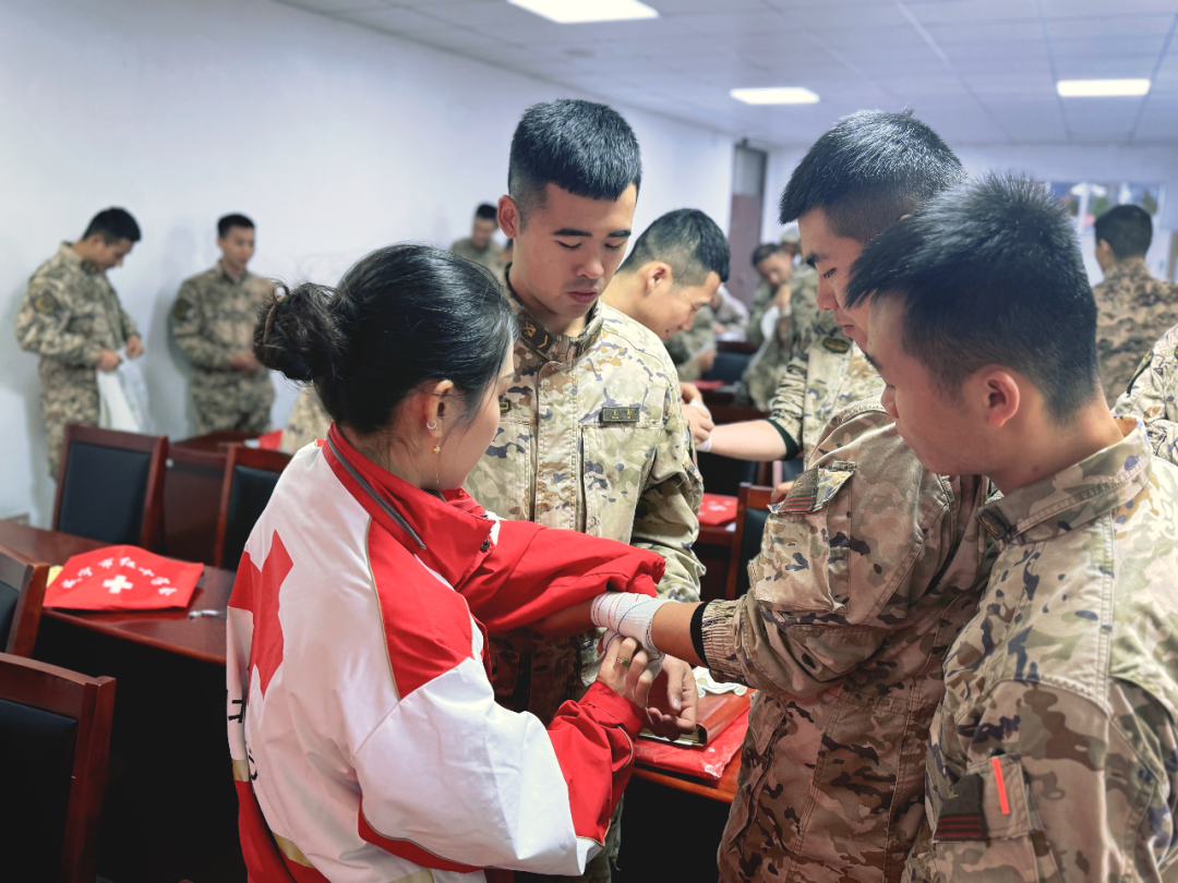 实操环节采取分组训练模式。在师资手把手指导下,官兵利用绷带、三角巾、模拟人等教具,逐一练习伤口包扎、肢体固定和心肺复苏技术。大家积极互动、反复演练,确保动作规范到位。训练场上学习秩序井然,氛围浓厚。